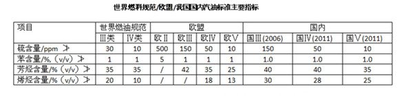汽油標(biāo)準(zhǔn)主要指標(biāo)國內(nèi)外對比圖這意味著中國當(dāng)前的汽油標(biāo)準(zhǔn)是歐洲、日本的15倍,美國的5倍,柴油則是歐日標(biāo)準(zhǔn)的30余倍。這里的標(biāo)準(zhǔn),說的是規(guī)定上的標(biāo)準(zhǔn),而執(zhí)行上的情況,低得更加慘烈,2012年《齊魯晚報》在山東隨機抽取了6份93號汽油樣品,其中有2份汽油的硫含量高達(dá)680ppm、910ppm。